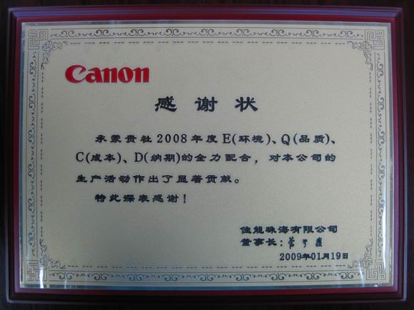 利達光電榮獲佳能珠海2008年度最佳供應商稱號