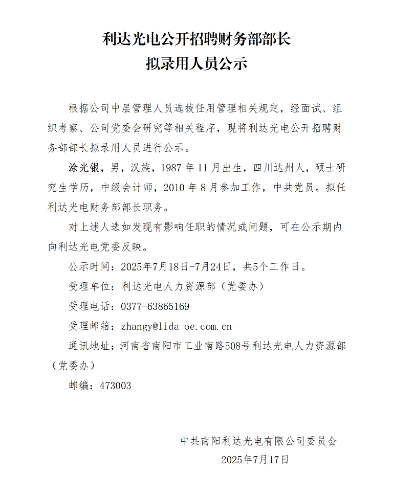 - (2025-07-17)利達(dá)光電公開招聘財務(wù)部部長擬錄用人員公示